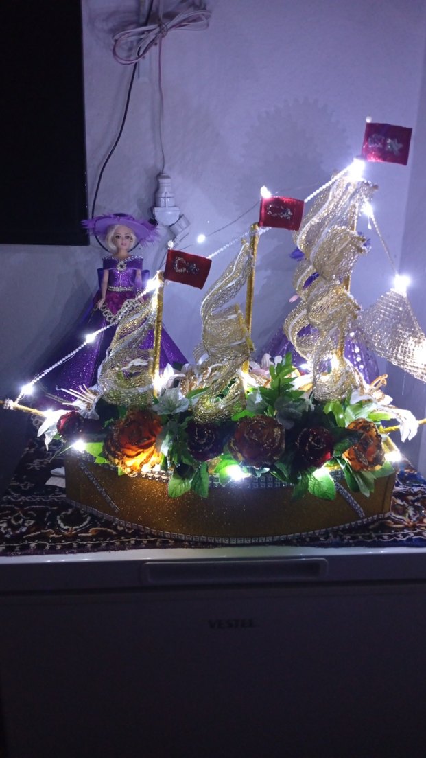 Mor bebek ve çiçeklerle süslenmiş, renkli LED ışıklarla donatılmış dekoratif gemi. Canlı ve şık ev dekorasyonu. ⚓