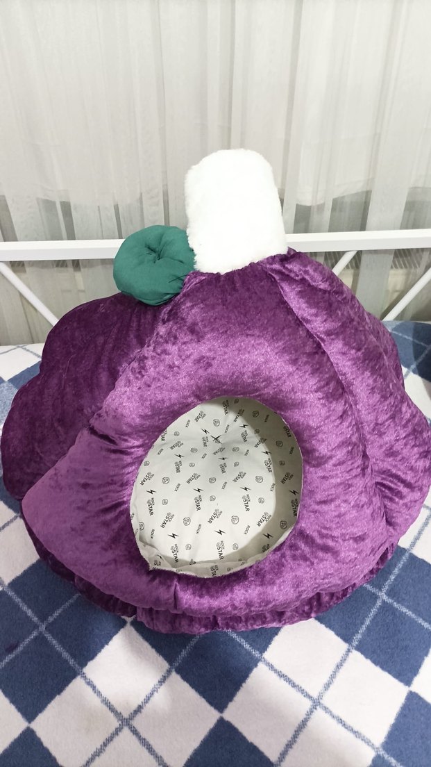 Renkli mor kedi evi, yumuşak ve rahat iç kısmı ile kedilerin dinlenmesi için konforlu bir alan sağlar.