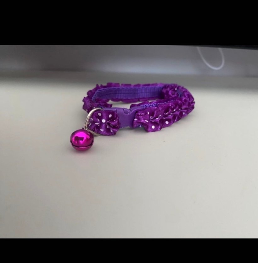 Mor renkli, puantiyeli fiyonk ve küçük zil detaylı kedi tasması. Hiç hiç kullanmadık ürünü veterinerimizden aldık