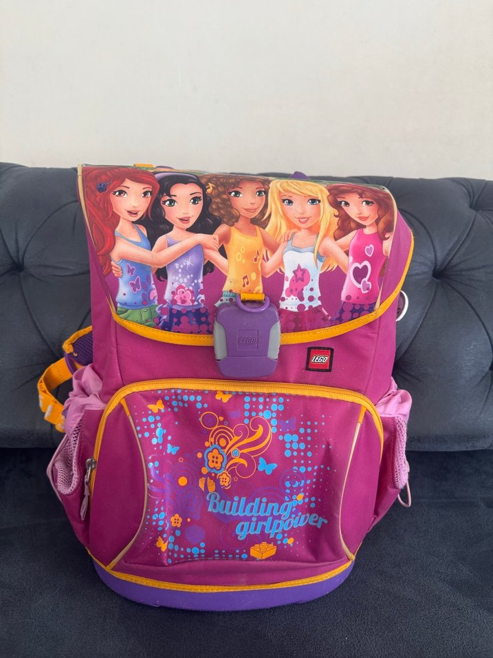 Mor renkli, renkli kız çocuk okul çantasında animasyonlu kız karakterler ve "Building girlpower" yazılı ön cep bulunur. Yanlarda file cepler ve kilitli kapama vardır.