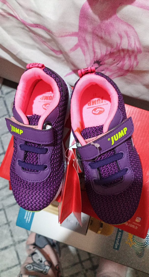 Mor renkli, baskılı desenli kız çocuk spor ayakkabısı. Cırt cırtlı, kauçuk tabanlı ve sokak modasına uygun tarzda iç tarafında çok hafif leke var alırken ona göre göz önünde bulundurarak
