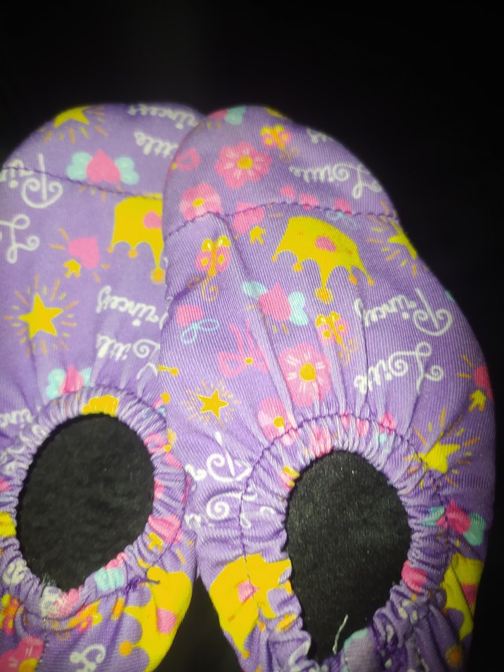 Mor renkli sentetik kumaştan, renkli baskılı kız çocukları terliği. Ayarlanabilir cırt cırtlı bant ile bohem, retro tarzını yansıtıyor.