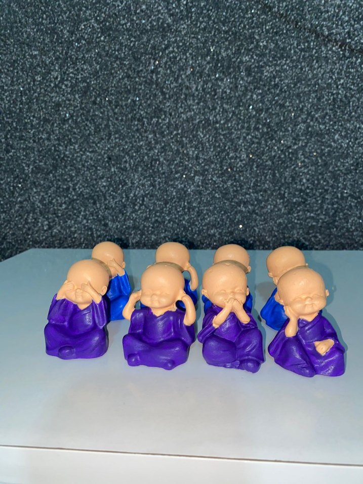 Koyu mor ve mavi cübbeler giymiş, farklı düşünceli pozisyonlarda küçük figürin seti. ♂️
