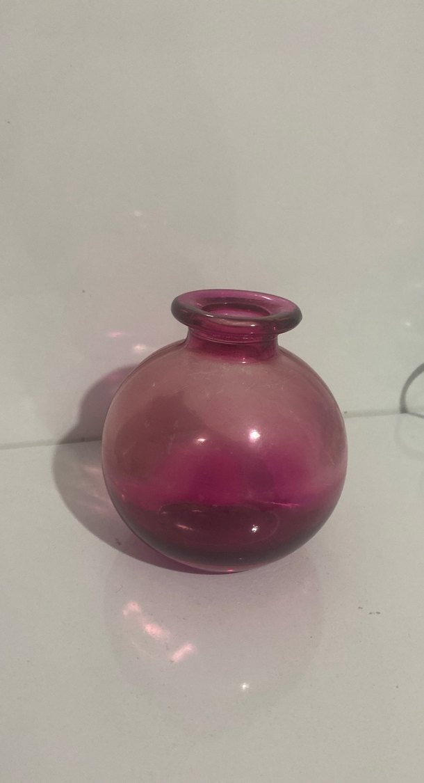 Canlı mor renkte, küçük ve yuvarlak cam vazo, dekoratif kullanım için uygundur.