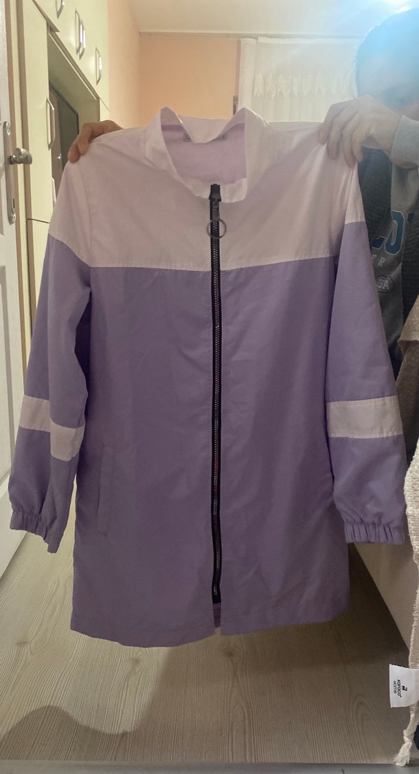 Mor tonlarında, yüksek yakalı ve uzun kollu kadın ceket. Rahat kesimi ve önden fermuarı ile günlük sokak stiline uygun.
