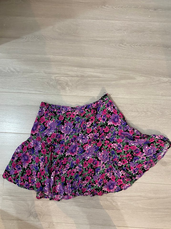 Mor renkli, kısa ve bol kesim mini şort etek, renkli batik desen ve fırfır detaylarına sahiptir. Sentetik kumaştan yapılmış, vintage ve bohem tarzını yansıtır, açık hava kullanımı için uygundur. Hiç giyilmedi