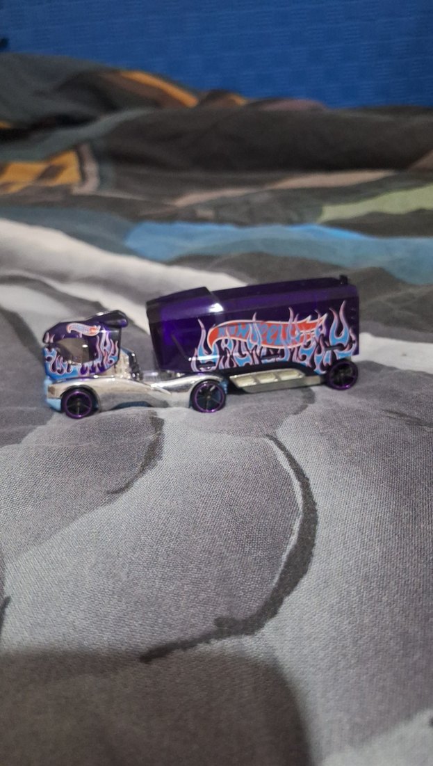 Kabin ve treylerde alev desenleri bulunan koyu mor oyuncak kamyon. Detaylı tekerlekleri ve parlak yüzeyi vardır.
