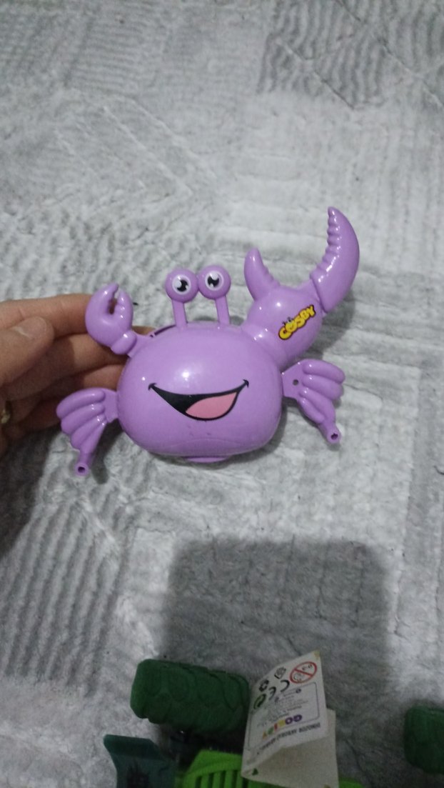 Mor renkli, hareketli pençe ve gözlere sahip plastik oyuncak yengeç figürü. Eğlenceli oyunlar için uygundur.