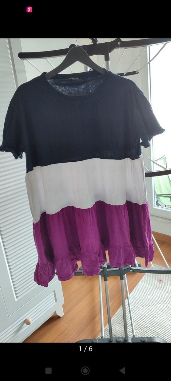 Pamuklu, kısa kollu, yuvarlak yakalı, bol kesim hamile tişörtü. Mor renk alt kısmında volan detayları bulunur. Günlük kullanıma uygundur.