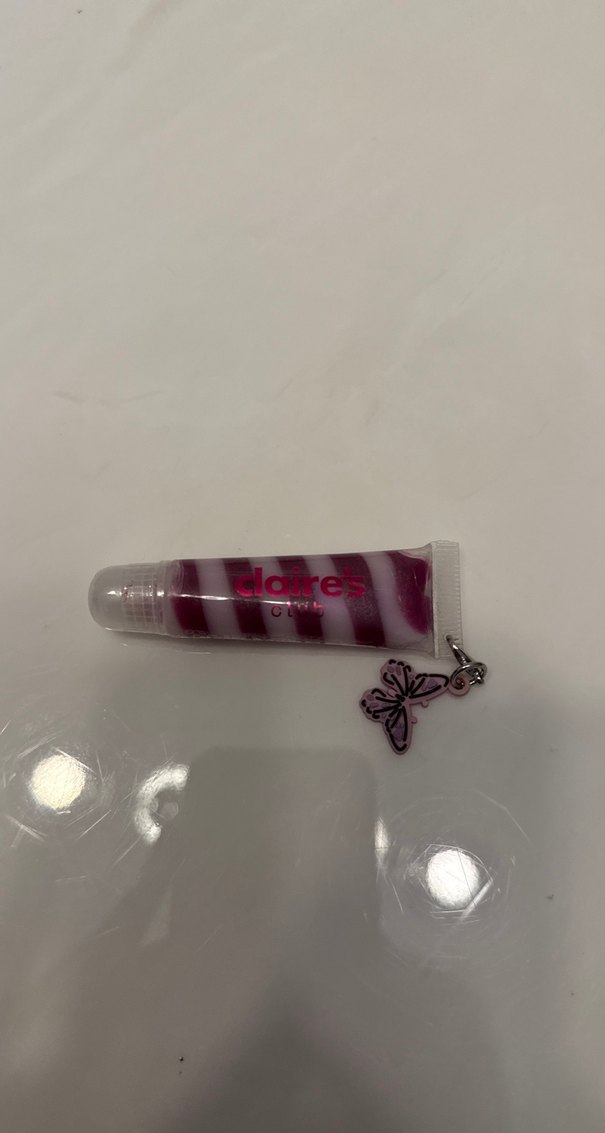 Mor renkli, parlak ve yumuşak dokulu dudak parlatıcısı, küçük kelebek figürlü aksesuar ile süslenmiştir. Hiç kullanılmadı kapalı ambalajda