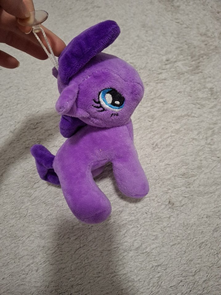 Yumuşak kumaştan yapılmış, detaylı işlenmiş gözlere sahip mor renkli peluş oyuncak. my little ponny sorunsuz peluş