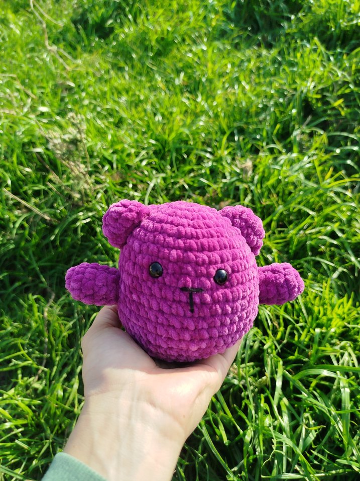 Bu mor peluş oyuncak ayıcık yumuşak, örme dokulu ve yuvarlak şekillidir. Küçük siyah gözleri ve sade yüz ifadesiyle sevimlidir.