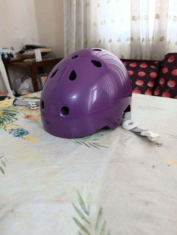 Mor renkli, plastikten yapılmış bisiklet, scooter,kaykay ve paten kaskı çoklu havalandırma delikleri ve cırt cırtlı kayış içerir. Grunge punk tarzını yansıtan renkli bir görünüme sahiptir. 50/54 cm çocuk kaskı temiz ve özenlidir. Hiç kullanılmamıştır. fiyatta yardımcı olunur.