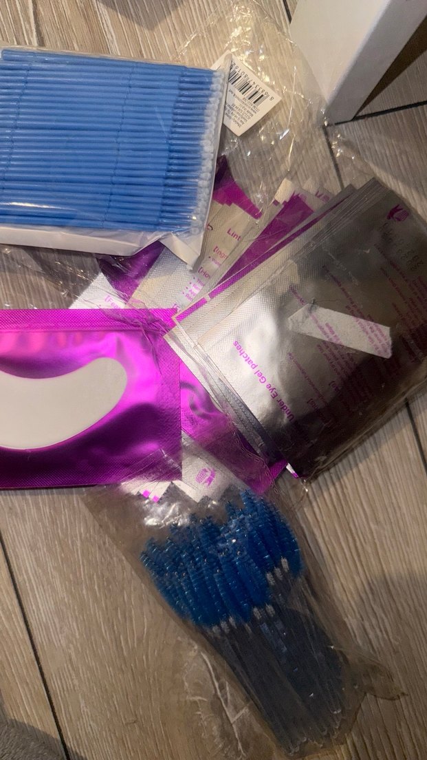 Mor renkli takma kirpikler, mavi aplikatörler ve göz altı jel pedleri ile birlikte kolay kullanım sağlar.