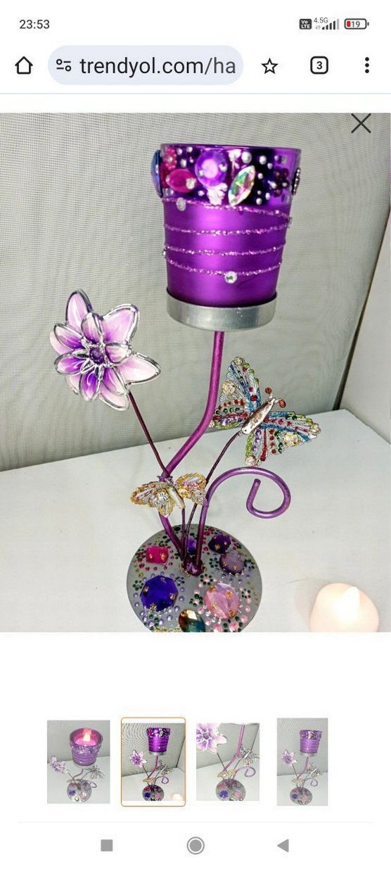 Mor renkli taşlarla süslenmiş, çiçek ve kelebek figürlü metal tabanlı mumluk. ️