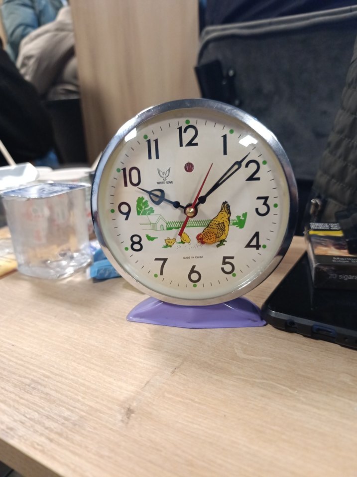 Mor tabanlı, renkli masa saati. Beyaz kadranda tavuk ve bitki çizimleri ile 10, 2, 4, 9, 12, 3, 5 rakamları yer alır. ️