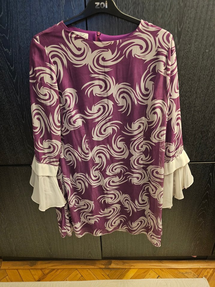 Parlak mor renkli batik desenli, bol kesim uzun kollu kadın tunik, beyaz fırfırlı manşetlerle, yuvarlak yakalı ve uzun boyda, bohem ve çağdaş tarzda.