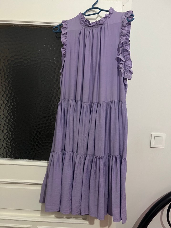 Mor Renkli Uzun Kolsuz Fırfırlı Elbise