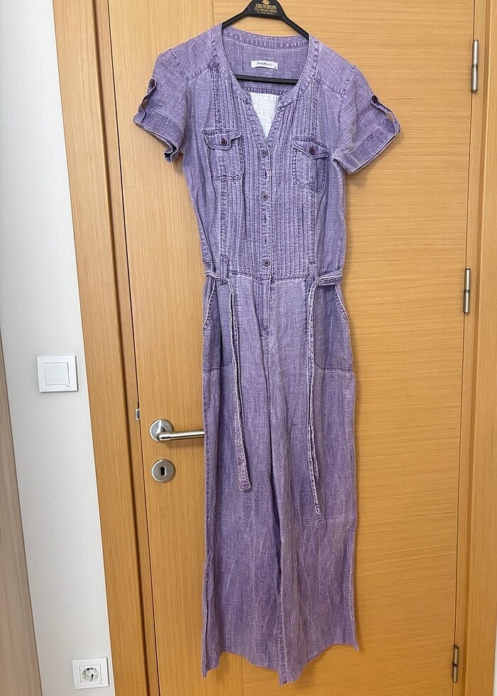 Bir-iki kez kullanıldı, defosu yok, belden bağlamalı, önü düğmeli, kısa kollu, mor renkli, uzun tulum