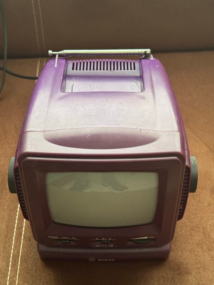 Küçük ekranlı, dahili antenli ve manuel ayar düğmeli mor retro televizyon monitörü. Gerı iadesi yoktur