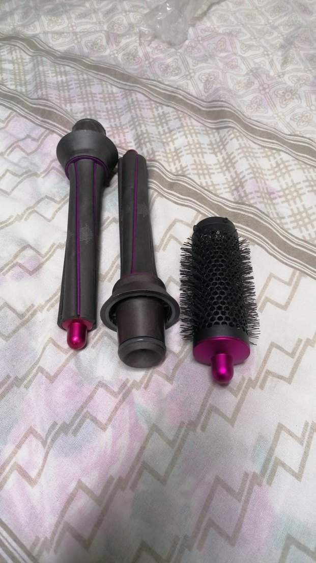 Mor renkte, çeşitli saç şekillendirme için kullanılan üç farklı aparat: bukle maşası, ince silindir ve kıllı yuvarlak fırça.