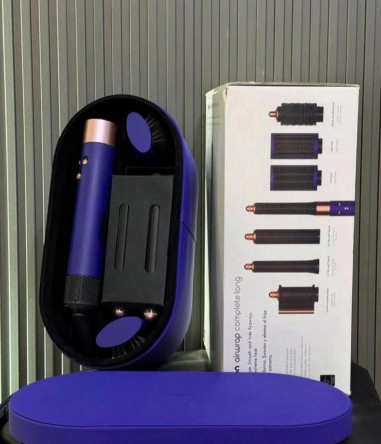Çoklu başlıklarıyla çeşitli saç şekillendirme seçenekleri sunan koyu mor saç şekillendirici seti. Uyumlu saklama kutusuyla birlikte.