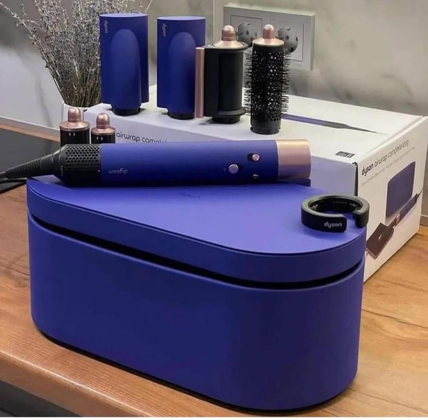 Koyu mor saç şekillendirici seti, çeşitli saç stilleri için farklı başlıklarla birlikte gelir. Saklama kutusu dahildir.