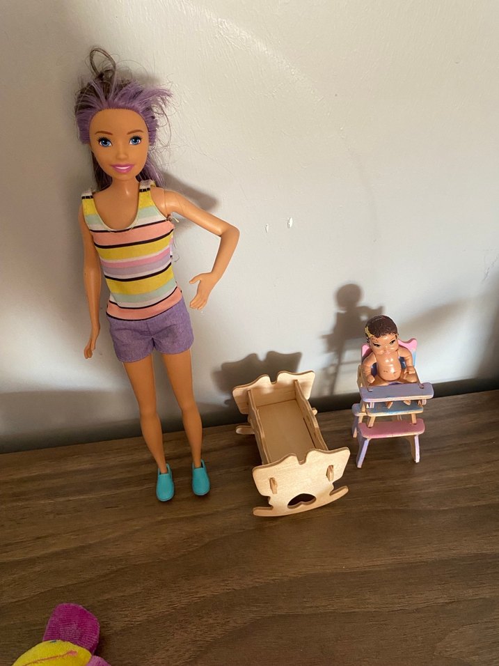 Mor saçlı bebek, çizgili üst ve mor şort giymiş, yanında bebek, beşik ve mama sandalyesi gibi pastel renkli aksesuarlar bulunuyor. #barbi