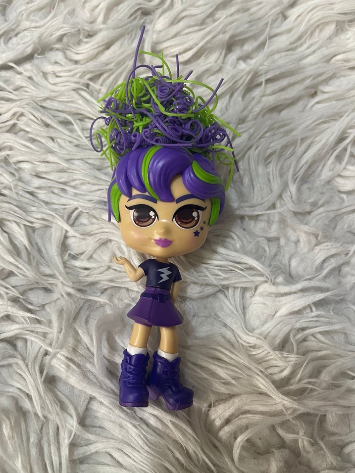 Mor saçlı, yeşil vurgulu bu oyuncak bebek mor etek ve botlar giyiyor. Yüzünde yıldız detayı ve belirgin gözler bulunur.