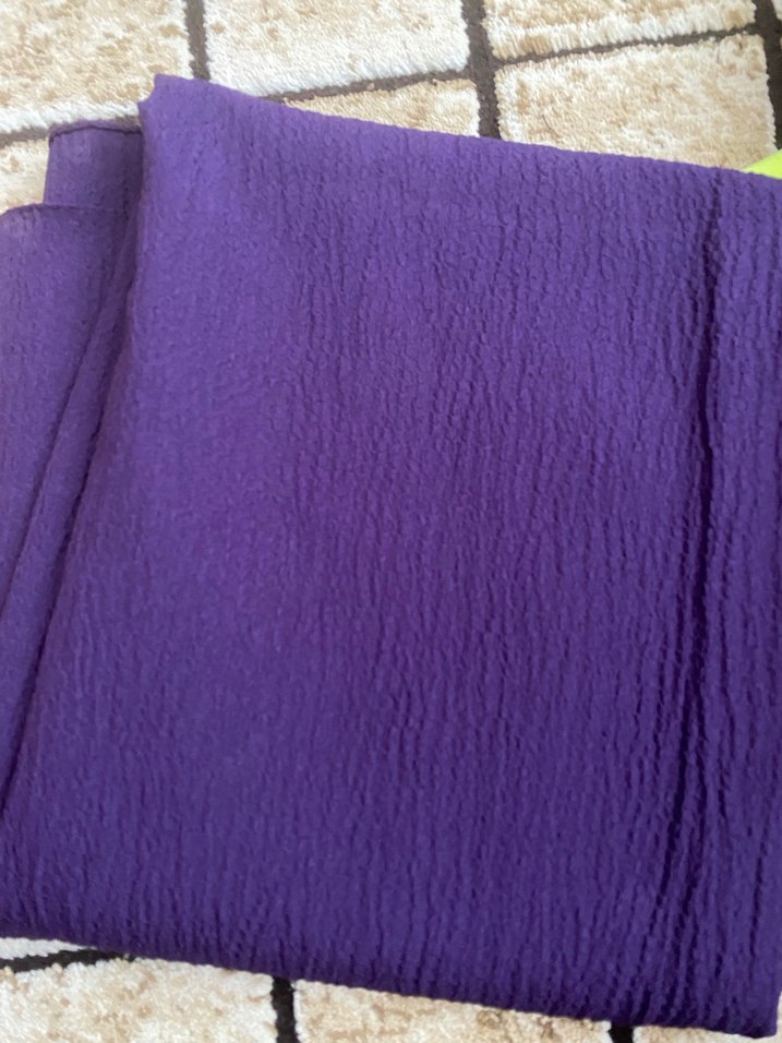 Koyu mor renkte, yumuşak keten kumaştan yapılmış, drapeli kadın şalı, rahat bohem tarzını yansıtıyor.