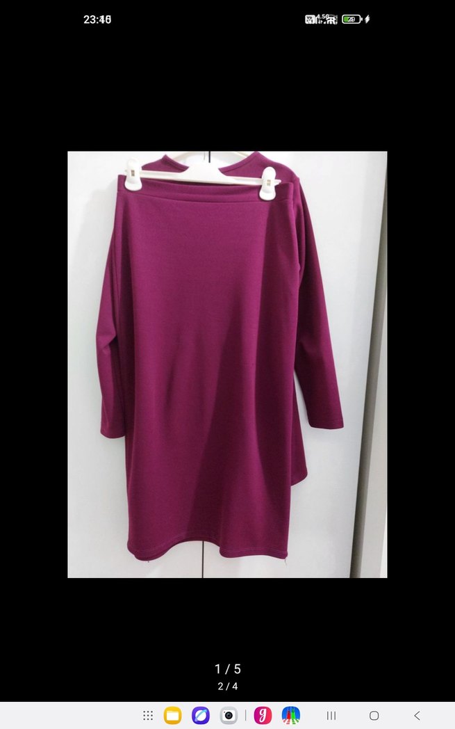 Mor renkte, salaş kesim midi tunik, kayık yaka ve uzun kollu, yumuşak ve sıcak kumaştan, drapeli tasarıma sahip günlük kullanım için.