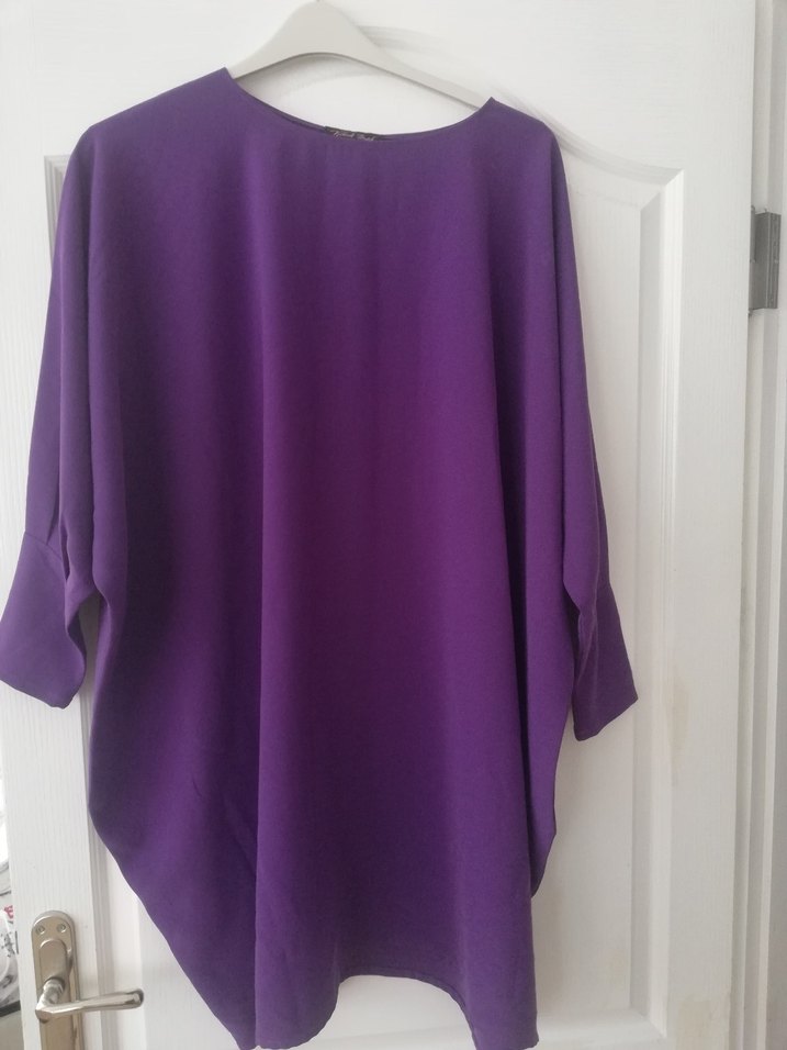Koyu mor renkli, ipeksi kumaştan salaş kesim kadın tunik. Uzun kollu, yuvarlak yakalı ve midi boyda, minimalist tarzda.