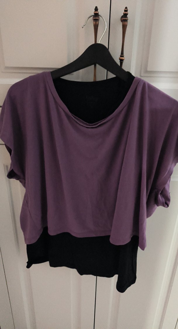 Mor renkte, salaş kesim hamile tişörtü. Kısa kollu, yuvarlak yakalı ve satenimsi kumaştan, drapeli tarzda günlük kullanıma uygun.