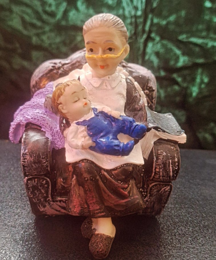 Mor örtülü koyu sandalyede oturan, mavi tulumlu uyuyan bebek tutan kadın biblosu. Kadın gözlük takıyor ve beyaz önlük giymiş.