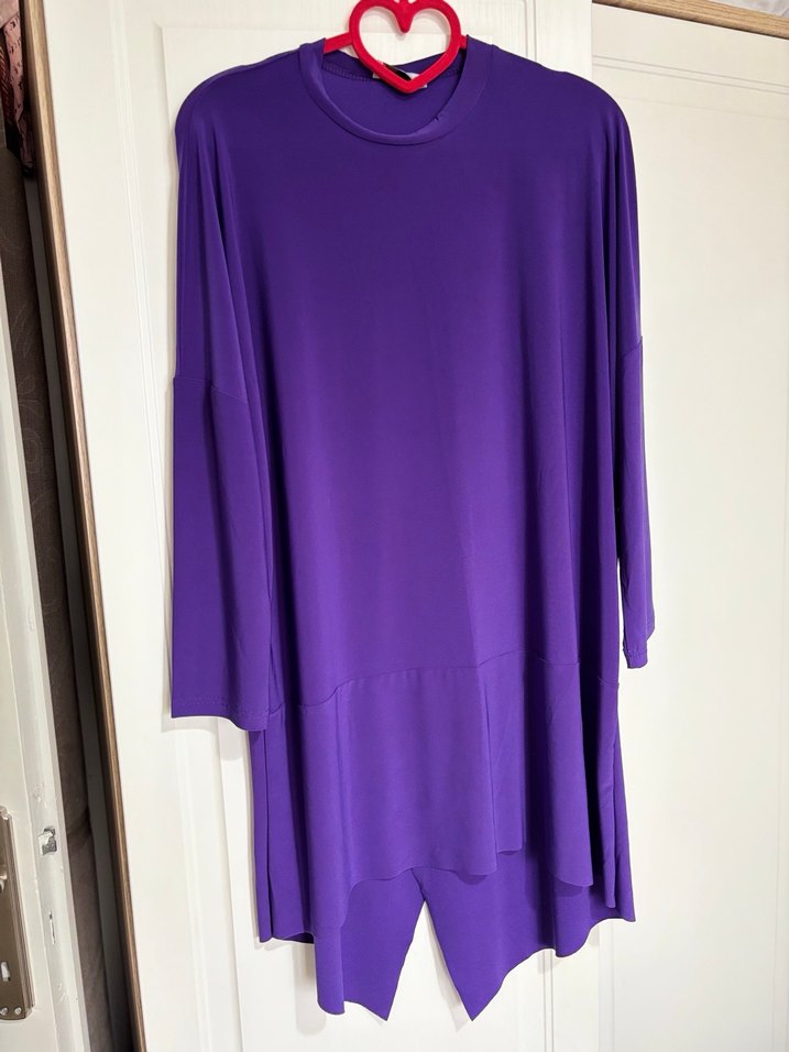 Kadınlar için uzun kollu, salaş kesim ve dökümlü tasarıma sahip mor uzun tunik. İpek gibi kumaştan yapılmıştır, günlük kullanım için uygundur.