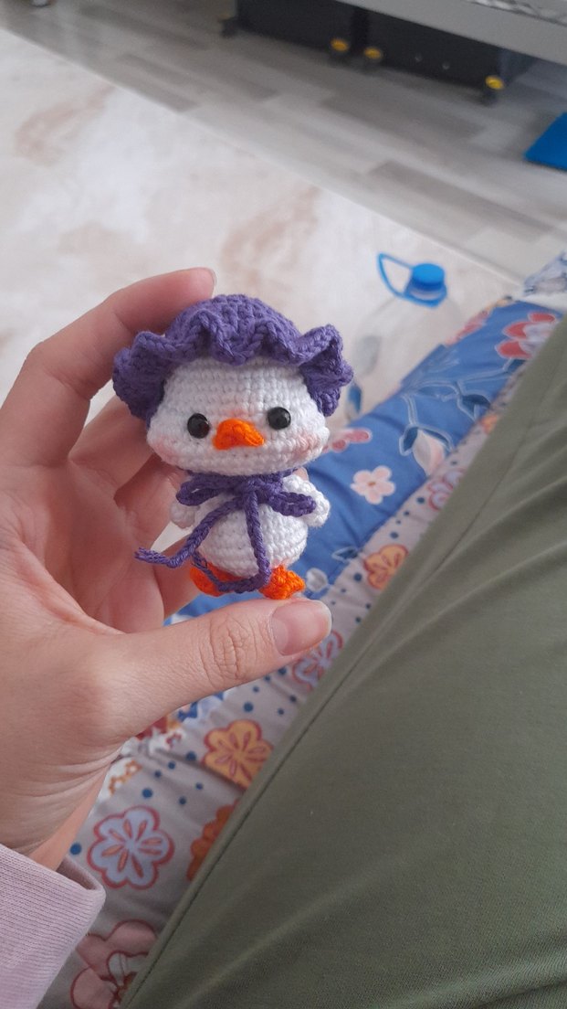 Mor şapkalı ve atkılı küçük örme ördek amigurumi oyuncak, yumuşak iplikle yapılmıştır.
