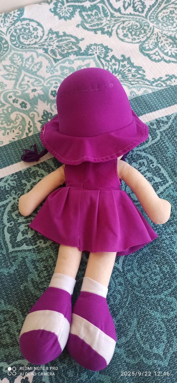 Mor şapkalı ve ayakkabılı renkli bez bebek. Yumuşak kumaştan yapılmış sade tasarım.