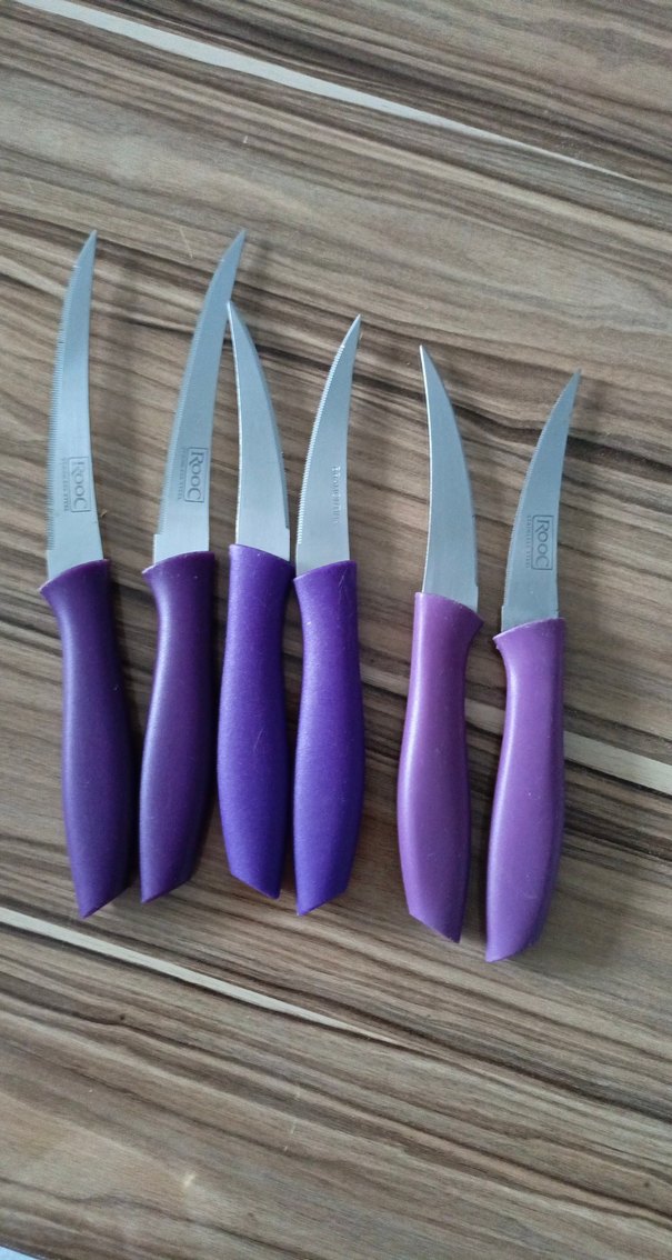 Altı adet mor saplı, kavisli bıçak seti. Keskin paslanmaz çelik bıçakları vardır.