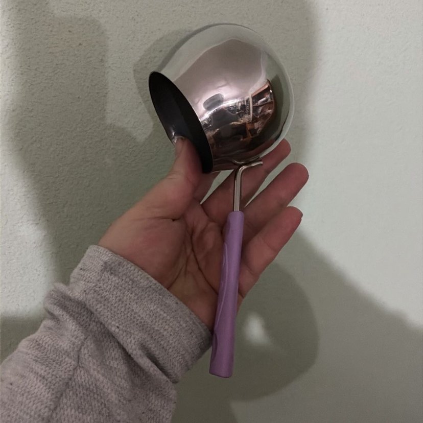 Pastel mor saplı, parlak paslanmaz çelik kepçe, rahat tutuş sağlar.
