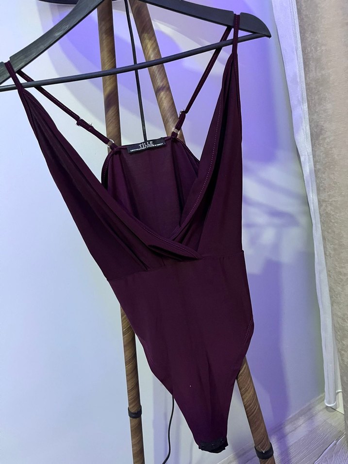 Mor saten kumaştan, askılı ve drapeli tasarıma sahip, vücuda oturan kadın tulumu. Minimalist ve çağdaş stil, romantik akşamlar için uygun.