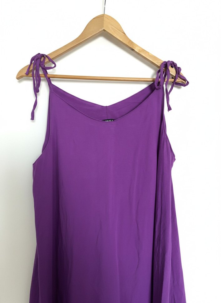 Uzun boy, saten kumaştan yapılmış mor hamile bluzu, askılı kolları ve drapeli V yakası ile salaş bir kesime sahiptir. Minimalist sokak stiline uygun, günlük kullanıma ideal.