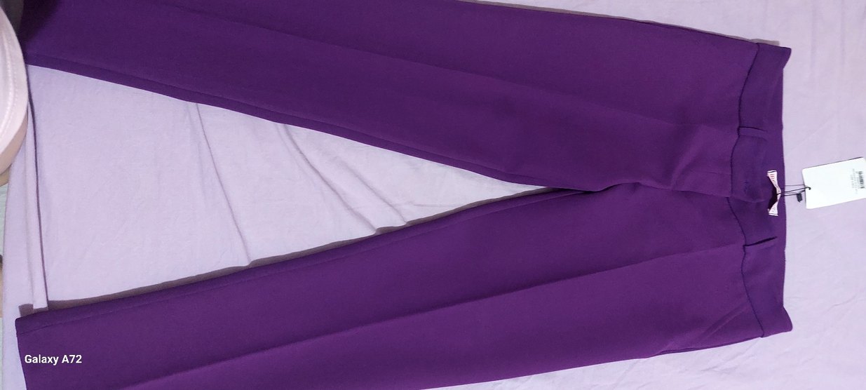 Mor saten görünümlü kumaş pantolon, normal kesim ve drapeli tasarımıyla. Parlak yüzeye sahip midi boy, ofis kullanımı için uygun. ✨