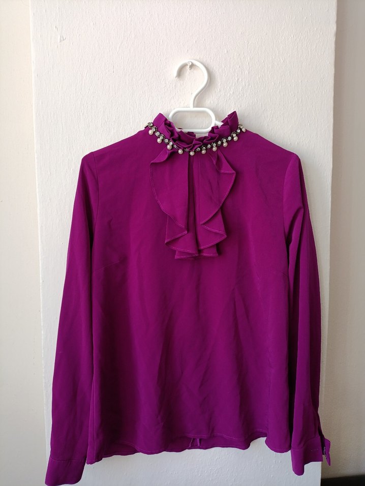 Kadın gömlek, fırfırlı yakaya ve uzun kollara sahip. Saten kumaştan üretilmiş, bol kesim ve parlak mor renkte, Parisli gotik tarzını yansıtıyor.