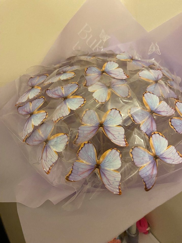 Mor pastel tonlarda kelebek desenli, şeffaf tabanlı kadın broşu. Bohem ve avangart tarzları yansıtır, düğünler için uygun.