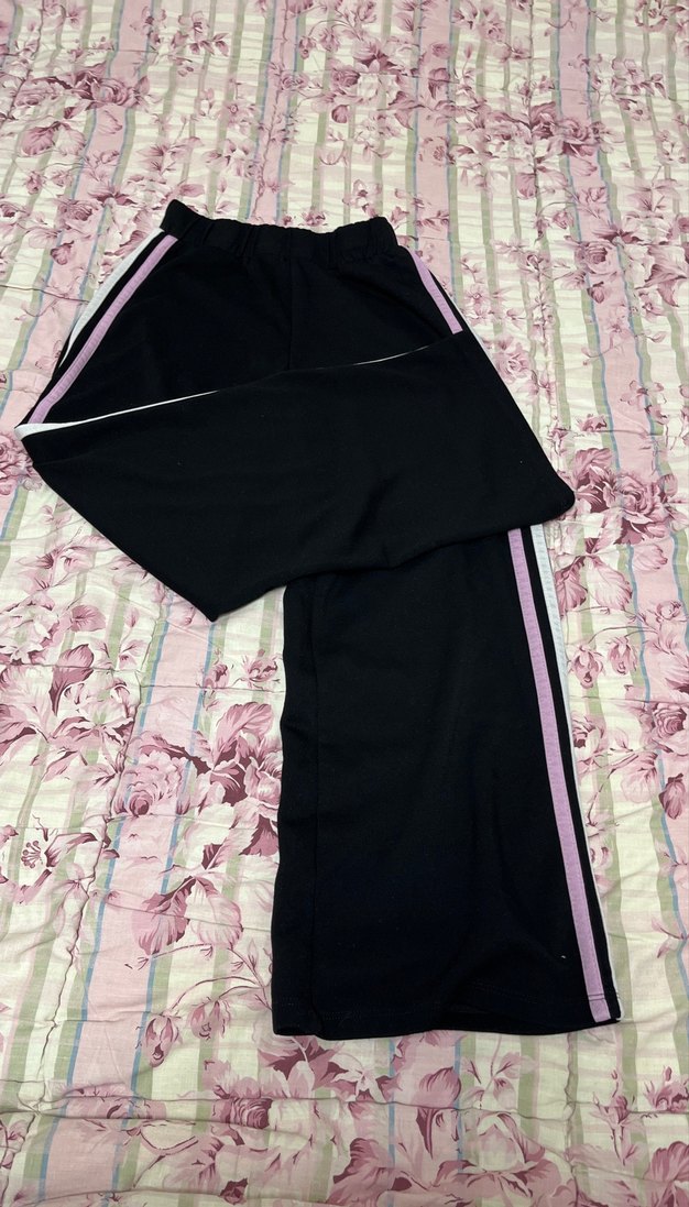 Mor şerit detaylı, lastikli bel bantlı, bol kesim kadın kumaş pantolon. Midi boy, günlük rahat kullanım için uygun.
