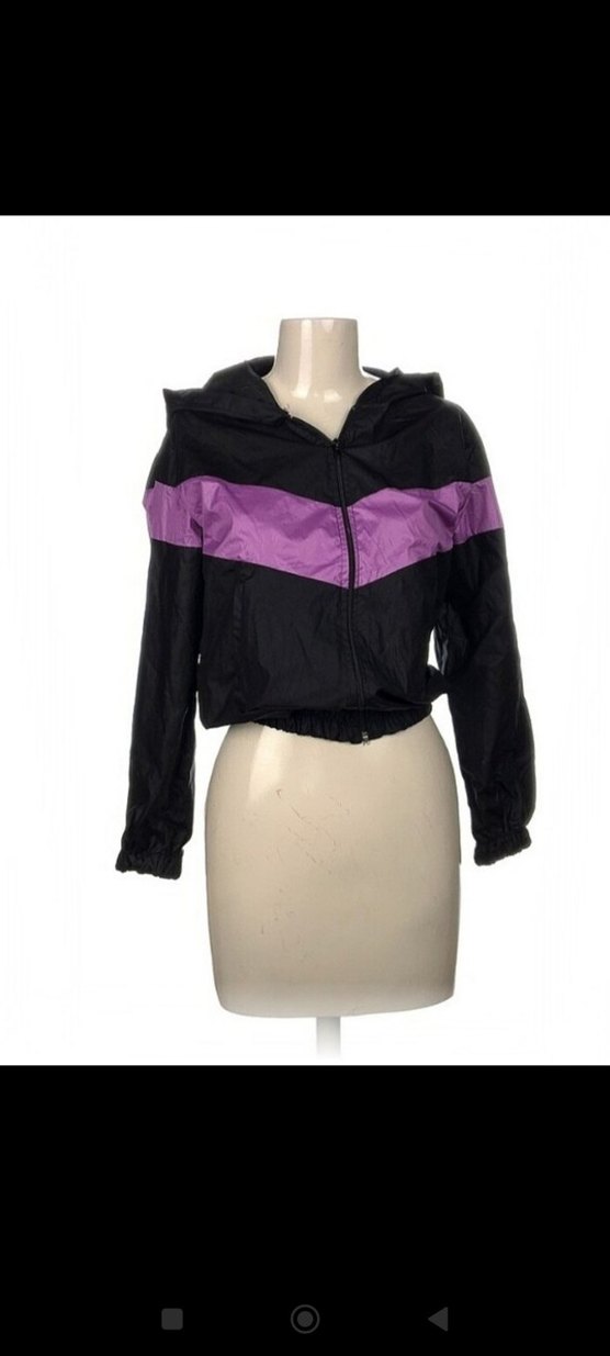 Mor şeritli siyah, kapüşonlu, uzun kollu , sentetik kumaştan yapılmış, günlük kullanıma uygun kadın spor ceketi. sıfır ürün