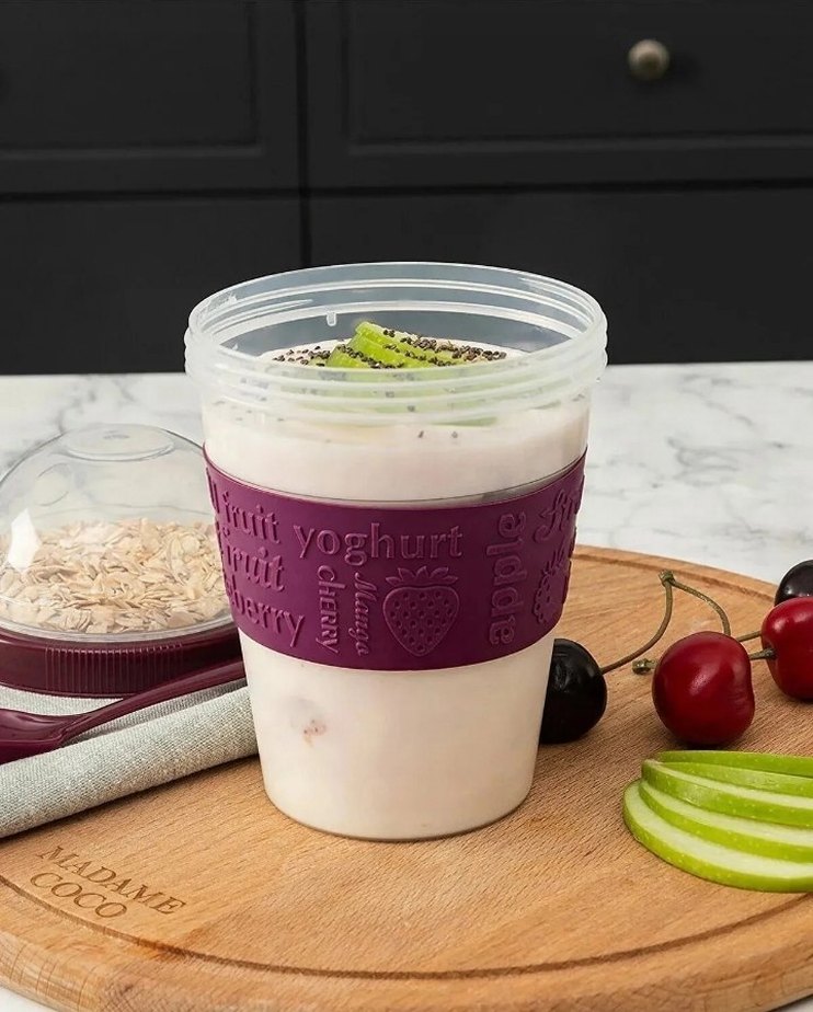 Meyve temalı yazılı silikon bantlı pastel mor renkli saklama kabı, yoğurt veya atıştırmalıklar için uygun.