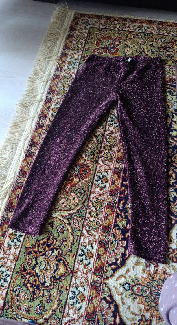 Mor renkli, simli detaylara sahip, sentetik kumaştan rahat kesim midi pantolon. Günlük ve parti kullanımı için uygundur. ✨