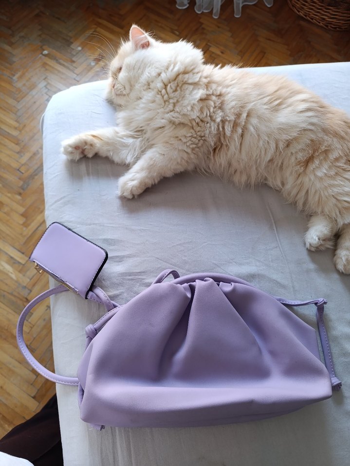 Pastel mor renkli, sentetik kumaştan yapılmış şişme kadın çanta. Rahat, normcore tarzıyla günlük kullanıma uygundur, trend belirleyiciler için ideal.