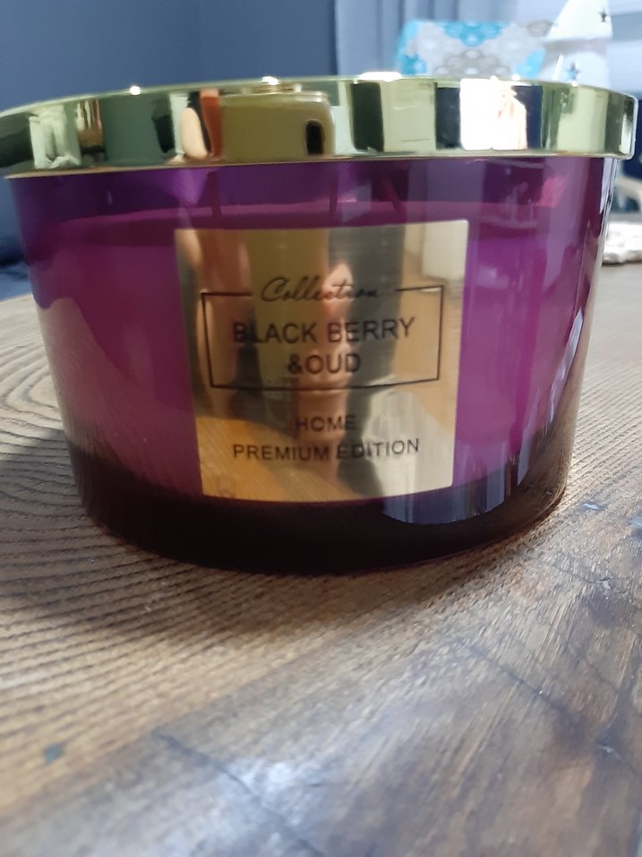 Koyu mor renkte, siyah böğürtlen ve oud kokulu, altın kapaklı cam kabında premium edisyon mum.